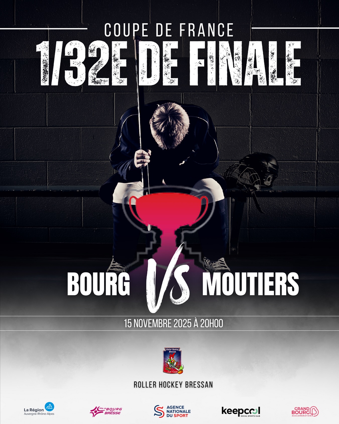 Ce samedi 15 novembre à 20h, le Roller Hockey Bressan reçoit MOUTIERS pour un duel décisif à domicile. Nos Bressans sont prêts à tout donner sur le terrain pour décrocher leur place en 1/16e de finale ! 🔥